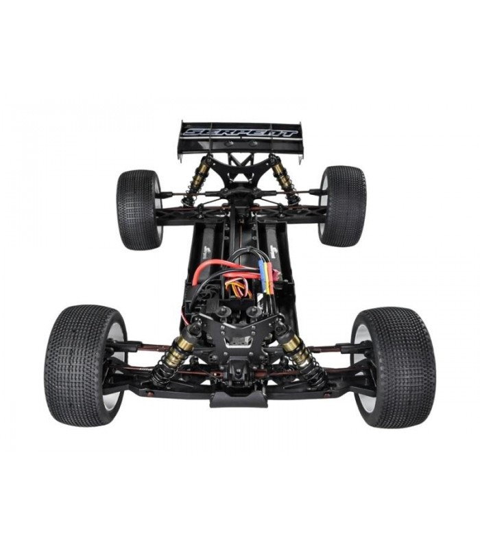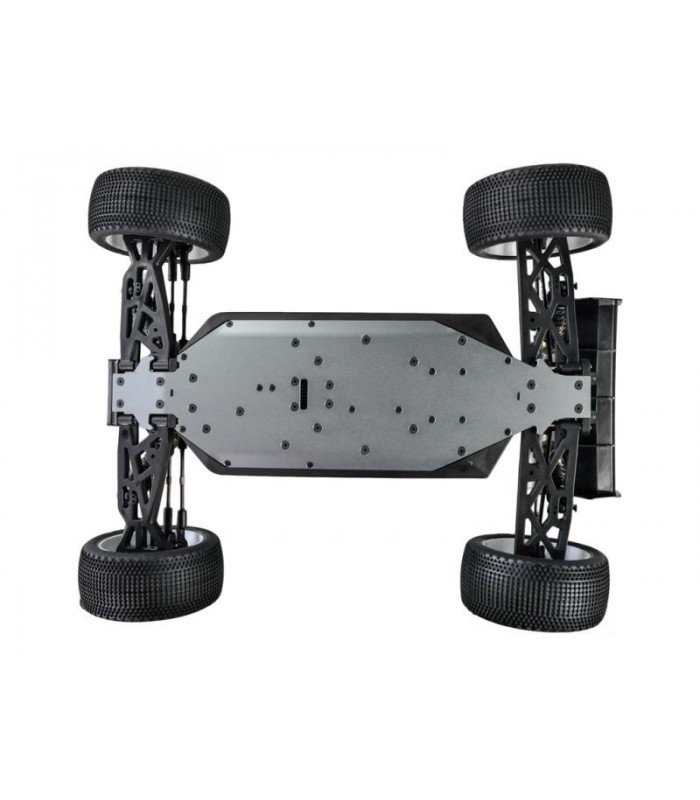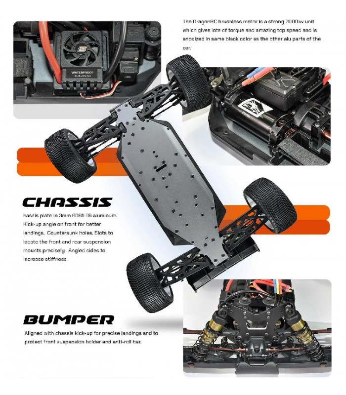 Kit Listo para rodar que incluye emisora Dragon Rc 2.4Ghz, servo de piñonería metálica de 25kg de fuerza, variador de 150A de potencia, motor brushless 2000KV, ruedas premontadas Truggy, carrocería pre-cortada y pintada y decorada y alerón. Chasis de aluminio, amortiguadores Big Bore, barras estabilizadoras y 3 diferenciales.