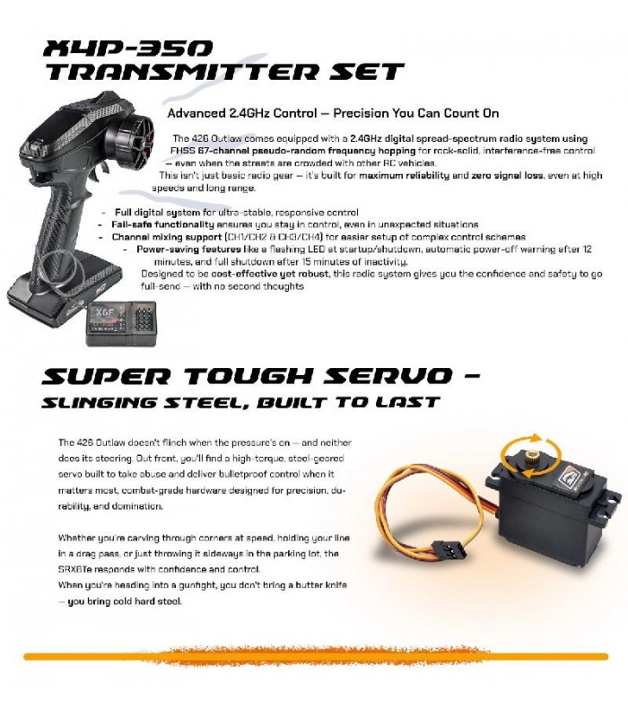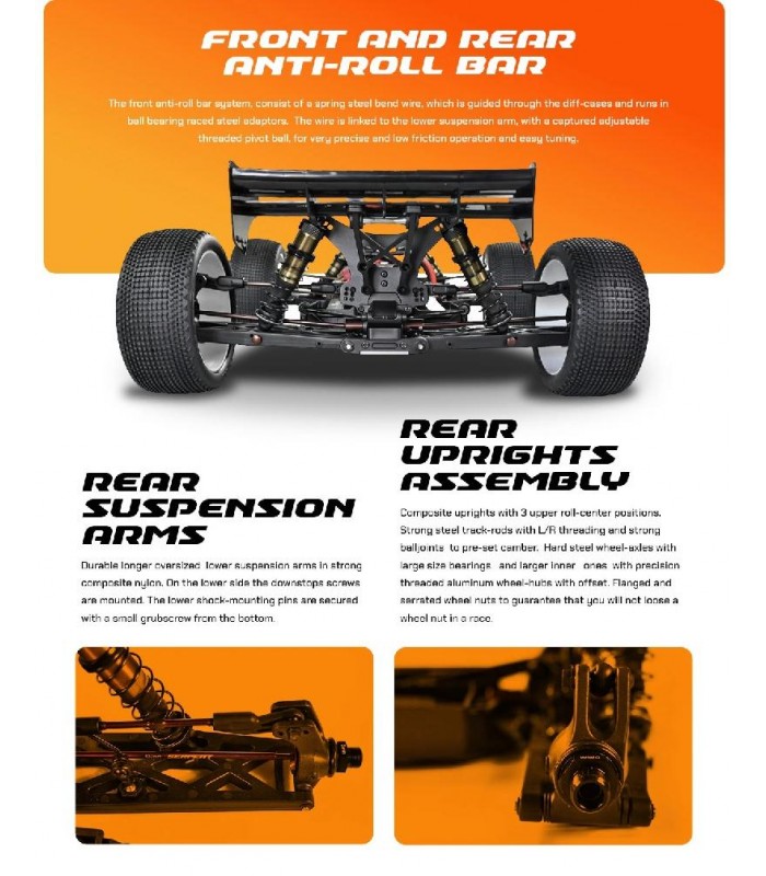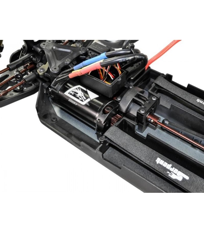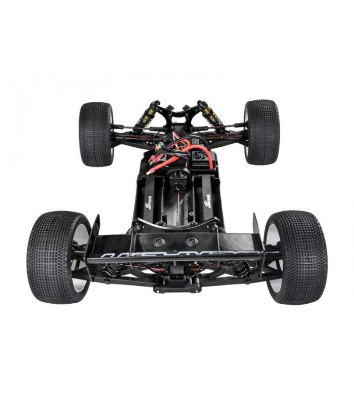 Kit Listo para rodar que incluye emisora Dragon Rc 2.4Ghz, servo de piñonería metálica de 25kg de fuerza, variador de 150A de potencia, motor brushless 2000KV, ruedas premontadas Truggy, carrocería pre-cortada y pintada y decorada y alerón. Chasis de aluminio, amortiguadores Big Bore, barras estabilizadoras y 3 diferenciales.